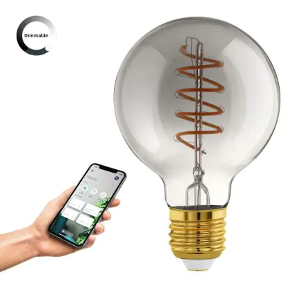 Die Eglo Connect.Z Smart LED Globe E27 Fadenlampe Smokey 4W 150lm - 820 Extra Warmweiß | Dimmbar - Ersatz Für 15W ist eine effiziente E27 LED-Lampe mit Retrodesign und der perfekte Ersatz für Ihre konventionellen 15W Lampen mit E27. Zudem strahlt sie Licht in der Farbtemperatur 2000K - Extra Warmweiß aus und punktet durch eine lange Lebensdauer.