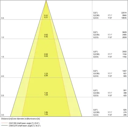 Beispiel: Wird eine Lampe mit einem Abstrahlwinkel von 60 Grad an der Decke (2,5 m Höhe) angebracht, erzeugt sie einen Lichtkegel von 2,9 Metern Durchmesser. Hat die Lampe hingegen einen Abstrahlwinkel von 120 Grad, beträgt der Lichtkegel 8,7 Meter im Durchmesser. |