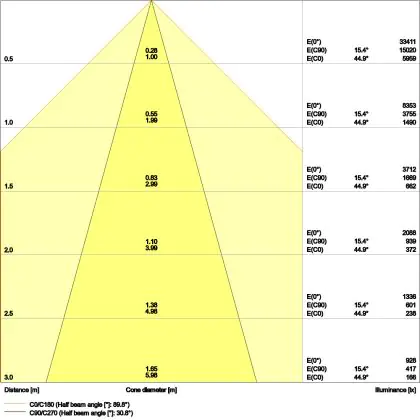 Beispiel: Wird eine Lampe mit einem Abstrahlwinkel von 60 Grad an der Decke (2,5 m Höhe) angebracht, erzeugt sie einen Lichtkegel von 2,9 Metern Durchmesser. Hat die Lampe hingegen einen Abstrahlwinkel von 120 Grad, beträgt der Lichtkegel 8,7 Meter im Durchmesser. |