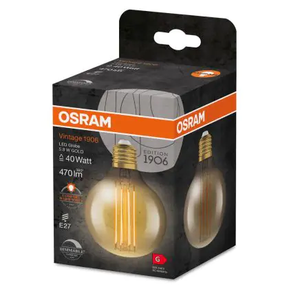 Die Ledvance Vintage 1906 LED E27 Globe Gold 5.8W 470lm - 822 Extra Warmweiß | Dimmbar - Ersatz für 40W ist eine effiziente E27 LED-Lampe mit Retrodesign und der perfekte Ersatz für Ihre konventionellen 40W Lampen mit E27. Zudem strahlt sie Licht in der Farbtemperatur 2200K - Extra Warmweiß aus und punktet durch eine lange Lebensdauer.