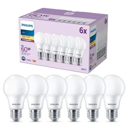 Die Mehrfachpackung 6x Philips Glühbirne LED E27 Birne Matt 8W 806lm - 827 Extra Warmweiß ist eine effiziente E27 LED-Lampe und der perfekte Ersatz für Ihre konventionellen W Lampen mit E27-Sockel. Zudem strahlt sie Licht in der Farbtemperatur 2700K - Extra Warmweiß aus und punktet durch eine lange Lebensdauer.