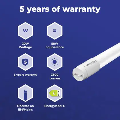 Diese LED-Röhre wird mit 20 Watt betrieben und strahlt 3300 lm aus. Daraus ergibt sich eine hohe Lumeneffizienz von lm/W. Sie ist somit deutlich effizienter als herkömmliche Leuchtstoffröhren, die ungefähr mit 80 lm/W daherkommen. Dies wirkt sich positiv auf Ihre Energiekosten aus!