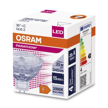 Die Osram Parathom LED-Spot GU5.3 MR16 3.8W 350lm 36D - 830 Warmweiß | Ersatz für 35W ist eine effiziente GU5.3 LED-Lampe und der perfekte Ersatz für Ihre konventionelle Halogenlampe mit 35W und einem GU5.3-Sockel, bei dem die beiden Stifte einen Abstand von 5,3 mm zueinander haben. Die Abkürzung MR16 zeigt Ihnen, dass der Reflektor einen Durchmesser von 5 cm hat. Zudem strahlt das Produkt Licht in der Farbtemperatur 3000K - Warmweiß aus und punktet durch eine lange Lebensdauer.