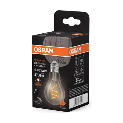 Die Osram Vintage 1906 LED Classic Slim E27 Birne Fadenlampe Klar 4.6W 470lm - 922 Extra Warmweiß | Höchste Farbwiedergabe - Dimmbar - Ersatz Für 40W ist eine effiziente E27 LED-Lampe mit Retrodesign und der perfekte Ersatz für Ihre konventionellen 40W Lampen mit E27. Zudem strahlt sie Licht in der Farbtemperatur 2200K - Extra Warmweiß aus und punktet durch eine lange Lebensdauer.
