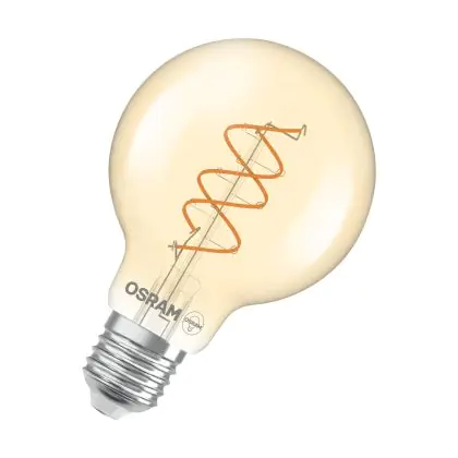 Die Osram Vintage 1906 LED E27 Globe Fadenlampe Twist Gold 8W 806lm - 922 Extra Warmweiß | Höchste Farbwiedergabe - Dimmbar - Ersatz Für 60W ist eine effiziente E27 LED-Lampe mit Retrodesign und der perfekte Ersatz für Ihre konventionellen 60W Lampen mit E27. Zudem strahlt sie Licht in der Farbtemperatur 2200K - Extra Warmweiß aus und punktet durch eine lange Lebensdauer.